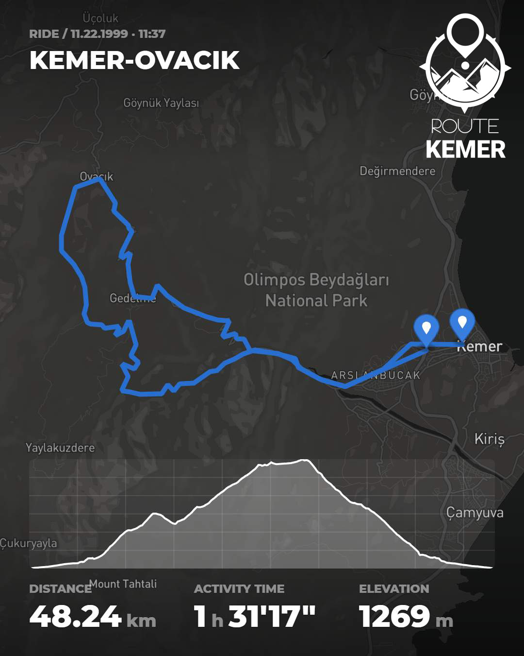 Kemer - Ovacık - Kemer parkuru, dağ bisikleti tutkunları için oldukça etkileyici ve zorlu bir döngü sunuyor. 48.65 kilometrelik bu parkur, 1,406 metre tırmanış ve aynı seviyede iniş içeriyor. Maksimum yüksekliği 1,108 metre olan parkur, dağların zirvelerinde zorlu bir tırmanış ve etkileyici manzaralar sunarken, minimum yüksekliği -3 metre ile sahil seviyesine yakın bölgelerden geçiyor.