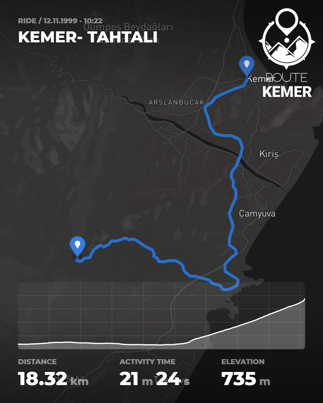 TrailRank değeri 11 olan parkurda, en düşük nokta -16 metre ile sahile yakın alanlardan da geçmektedir. Rota boyunca, Akdeniz'in kıyı şeridini arkanızda bırakarak dağların zirvesine doğru yükselirken çevrenizdeki doğanın güzelliği ve Kemer'in muhteşem manzaraları sizi büyüleyecek.