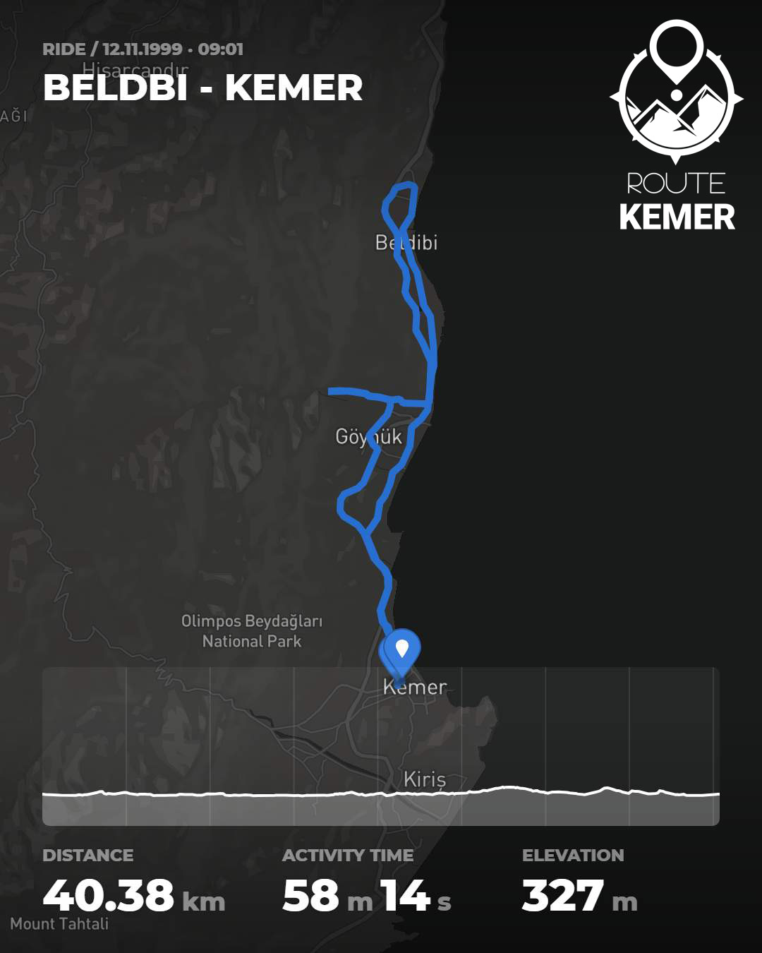 Kemer - Beldibi - Kemer rotası, yol bisikleti sürücüleri için keyifli ve rahat bir sürüş sunan, 40.5 kilometrelik döngüsel bir parkurdur. Bu rota, Kemer'den başlayarak Beldibi'ne uzanır ve geri dönerek tekrar Kemer'e ulaşır. Akdeniz kıyısında yer alan bu parkur, bisikletçilere muhteşem deniz manzaraları ve rahat bir sürüş deneyimi sunar.