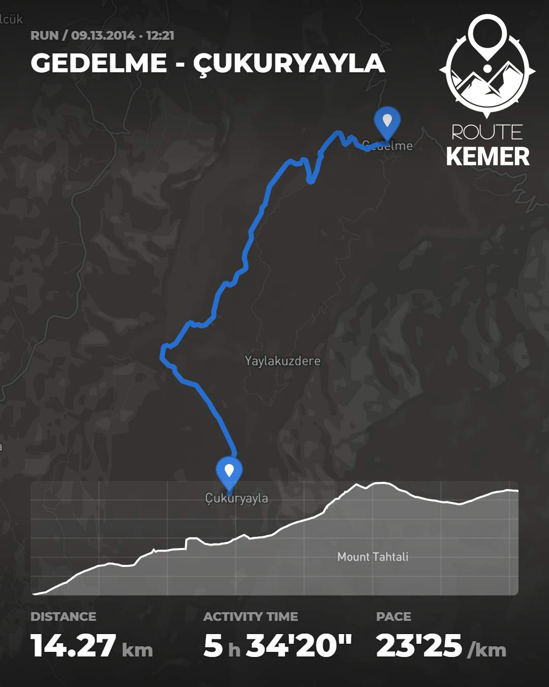 Kemer yaylaları arasında yer alan Gedelme'den başlayan rota ile Bölücekdibi, Kozlu Muğar, Yarıcak, Teke dağı eteklerinden geçilerek Karakoyunlu yörüklerinin yaylası Belenyayla'ya ulaşılıyor. Beydağlarını keşfe çıkanları 1700 m rakımlı yaylada asırlık sedir ağaçları karşılar. Beydağlarının en yüksek yaylaları arasında yer alan Belenyaylanın doğusunda akdenize paralel ilerleyen kıyı beydağları, güneyinde Tahtalı dağı, batısında beydağları (Akdağlar), kuzeyinde Teke dağı manzarası yer almaktadır. Gedelme Altınyaka rotasının Belenyayla'ya kadar olan çizginin aynısının kullanıldığı rota ile Belenyayladan sonra Güney yönünde bulunan Tahtalı Dağı istikametinde bulunan işaretler takip edilerek Çukuryayla ya ulaşılır. Tahtalı Dağı eteklerinde 1600 metredeki yayla, yaz aylarında kamp için bölgedeki en uygun alanlardan birisi. Çukuryaya'dan Tahtalı dağı zirvesine çıkmak isteyenler 4 km lik bir tırmanışdan sonra 2365 metreye ulaşabilir. Orta zorluk derecesine sahip rota için yürüyüş ve molalar için 7 saat ayırmak yeterli olacaktır. Güzergahı ters istikametten de yürümek mümkün.