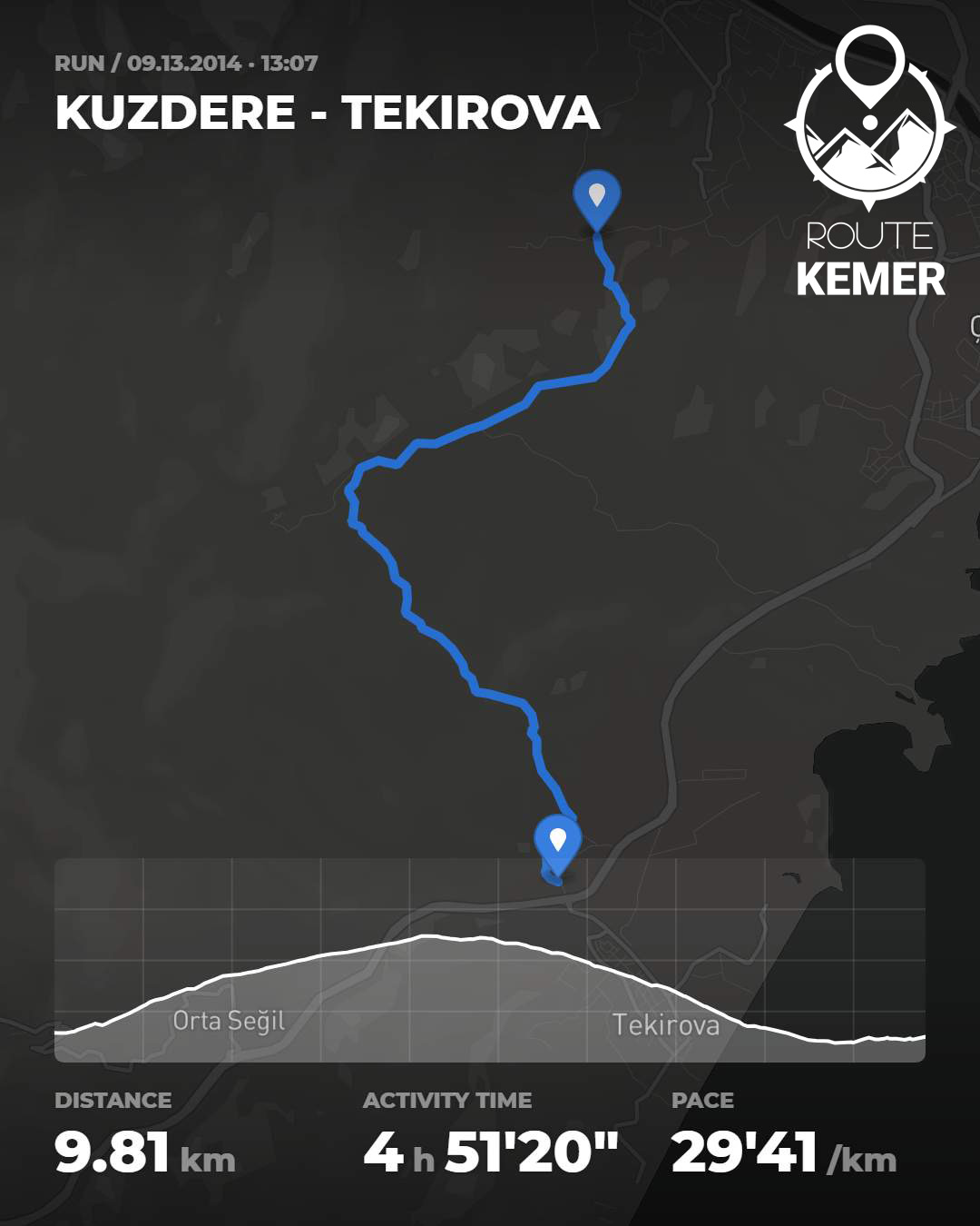 Kemer Kuzdere Mahallesi Keçili Mevkiinden başlayan rotamız Akboyun mevkiisine kadar kızıl çam içerisindeki patikadan Kemer manzarasını arkanıza alıp hafif rampa çıkılarak ulaşılıyor. Akboyun mevkiisinde bulunan teleferik alt istasyon asfaltından 1 km ilerledikten sonra yörük kavşağında Çukuryayla yürüyüş parkuru başlangıç noktası yol ayrımına geliyoruz. Biz Tekirova rotamızı takip ettiğimiz için Tekirova yönünü gösteren tabela istikametinde ilerleyerek İnlisu mevkiinden Tekirova sahili ve üç adalar manzarası eşliğinde patikadan inişe geçiyoruz. Yörüklerin bahar da yaylalara, sonbaharda kışlaklarına göç sırasında kullandığı bu Rotamızda bölgede hala yörük yaşamını inatla sürdüren bölge halkına rastlamak mümkün. Parkuru tamamlamak için işaretlerin peşinde önce Cumayeri Mevkii ne oradan da D400 karayolu üzerindeki Tekirova kavşağına geliyoruz ve buradaki tabelamızda rotamız son buluyor. Güzergah Sonbahar, Kış ve ilkbahar mevsimlerinde günü birlik keyifle yürüyüş yapabileceğiniz bölgedeki en güzel rotalardan birtanesi. 10 km lik rota için molalar ile birlikte 5 saat ayırmanız yeterli olacaktır.