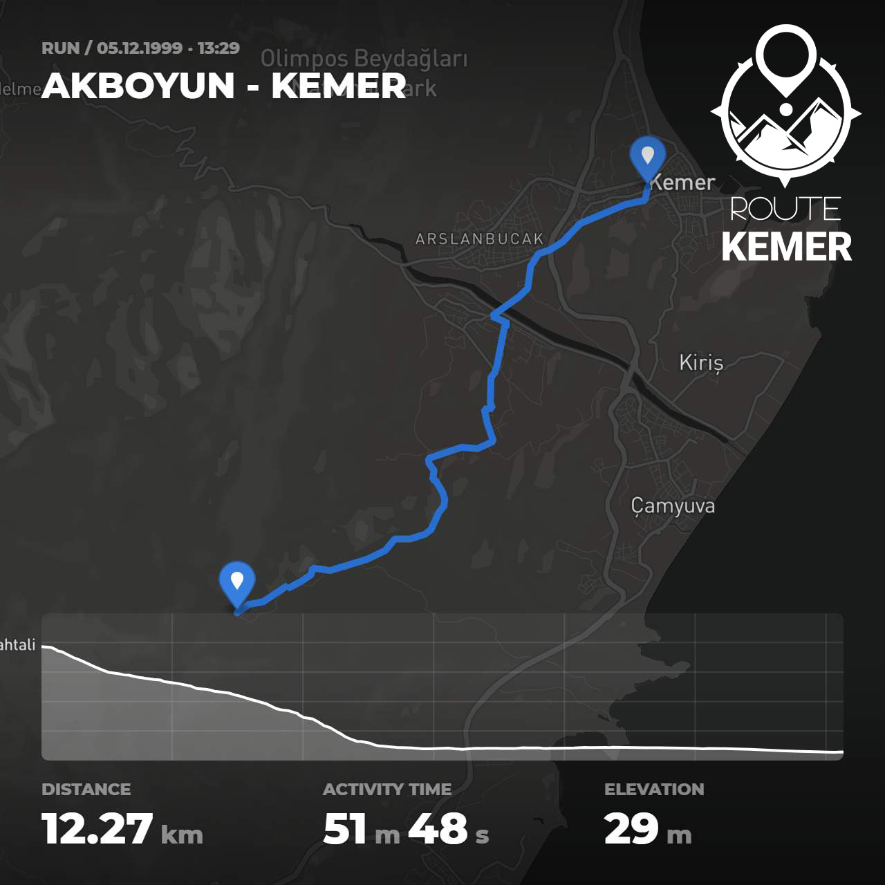 Akboyun-Kemer parkuru, 12.41 kilometre uzunluğunda, uzman seviyesinde sporculara hitap eden bir rotadır. Bu parkur, 717 metre yüksekliğe kadar çıkarak etkileyici bir manzara sunarken, 743 metre yükseklik kaybı ile dikkat çekici bir iniş deneyimi yaşatır. En yüksek noktası 717 metre, en düşük noktası ise -3 metre olup, bazı kısımlarda deniz seviyesinin altına kadar inen nadir ve ilginç bir arazi yapısı sunar.