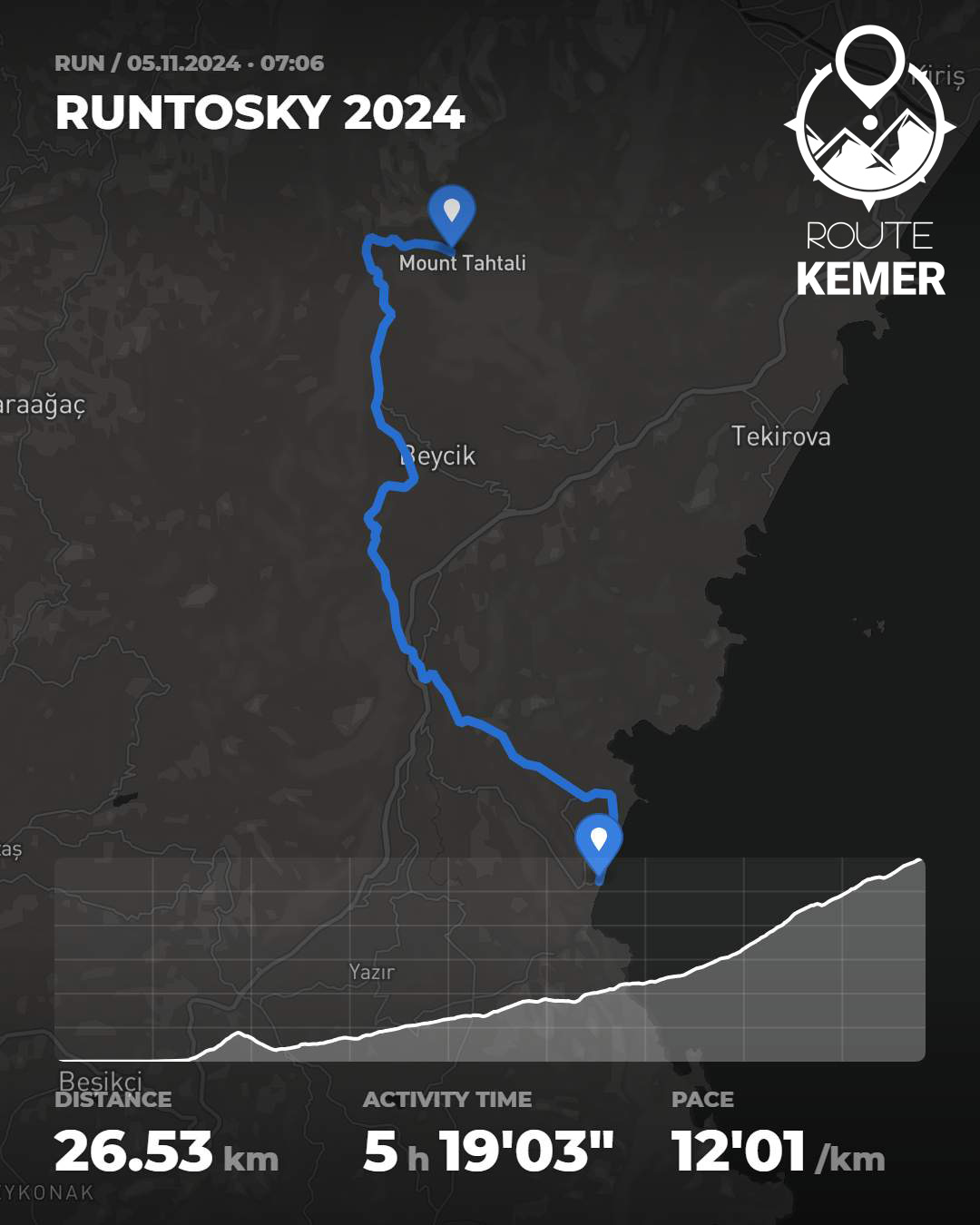 Bu koşu, dağların eteklerinden başlayıp gökyüzüne yükselen zorlu parkurları içeriyor. Parkurun toplam mesafesi boyunca koşucular, çam ormanlarından, sarp patikalardan ve nefes kesici manzaralardan geçerek Tahtalı Dağı zirvesine doğru ilerliyor. Tahtalı Dağı, 2.365 metre yüksekliğiyle yarışın sonunda sporculara Akdeniz'in mavi suları ile dağların zirvesini birleştiren muhteşem bir panorama sunuyor.