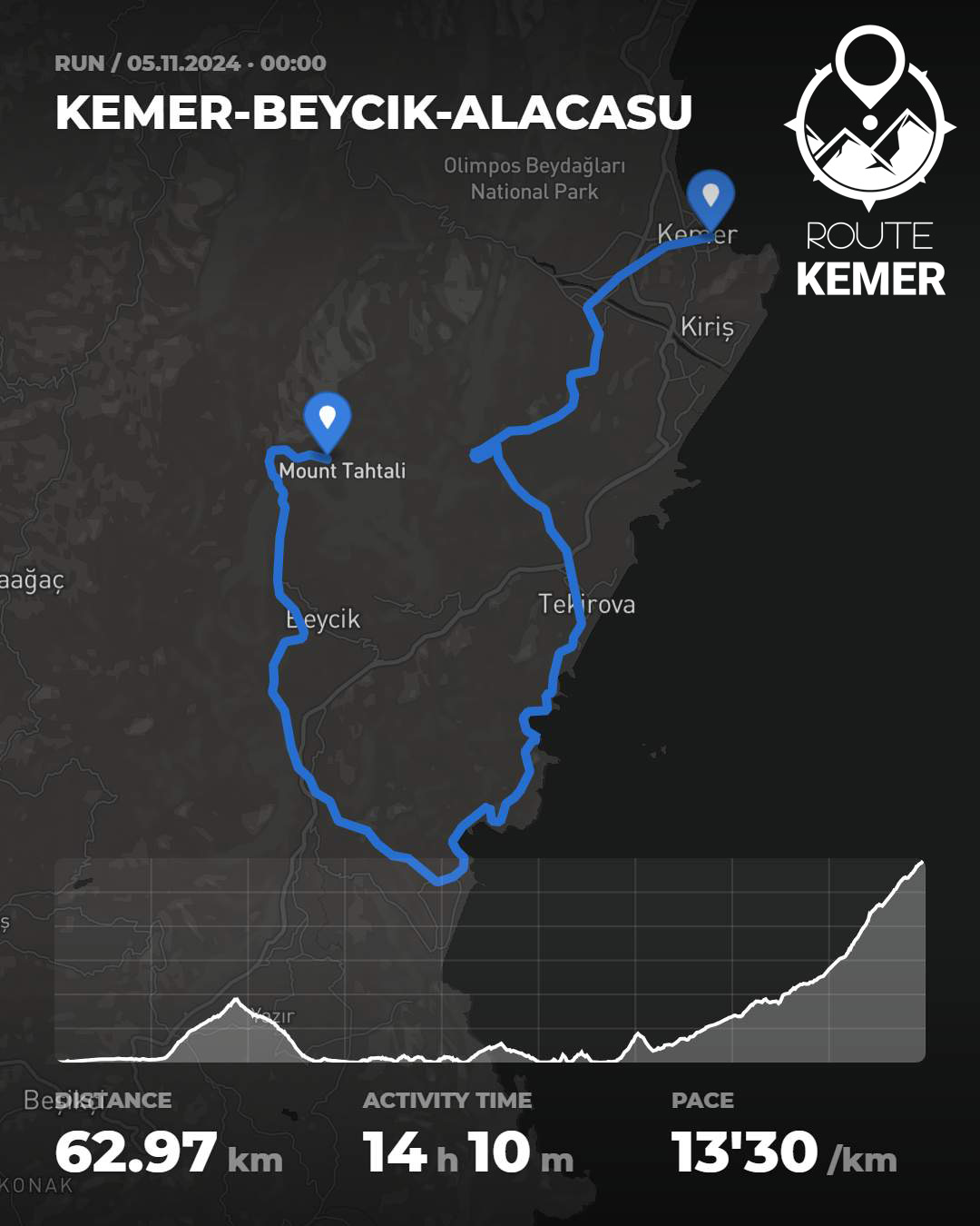 Bu rota, Kemer'den başlayarak Tahtalı Dağı'nın zirvesine kadar uzanan ve doğa ile iç içe unutulmaz bir yolculuk sunan bir yürüyüş rotasıdır. Rota boyunca Teke Koyu, Beycik Bükü, Kral Koyu, Dağ Geçidi ve Emzik Çeşme gibi etkileyici duraklardan geçerek son noktada Tahtalı Zirve'ye ulaşılır.